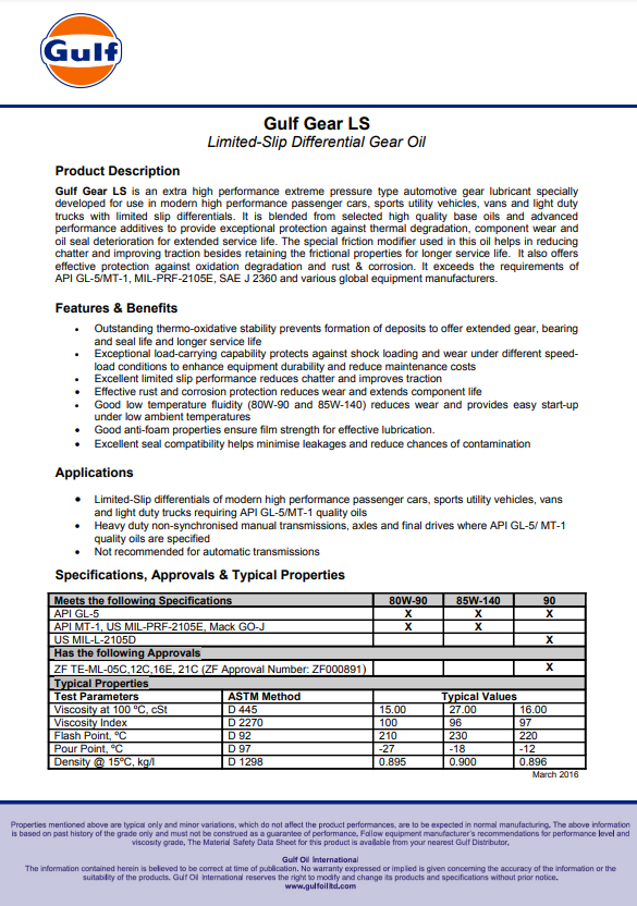 Designed for limited-slip differentials of passenger cars, sports utility vehicles, vans and light-duty trucks requiring API GL-5/ MT-1 quality oils. Heavy-duty, non-synchronised manual transmissions, axles and final drives where API GL-5/ MT-1 oils are specified.