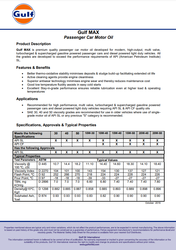 Gulf MAX is a premium quality passenger car motor oil developed for modern, high-output, multi-valve, turbocharged and supercharged gasoline-powered passenger cars and diesel-powered, light-duty vehicles.