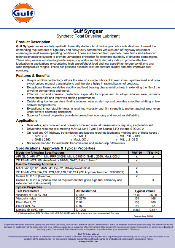 API GL-5, API MT-1 | MIL-PRF-2105E, MIL-L-2105 D | SAE J 2360 | Mack GO-J | ZF TE-ML- 07A, 08 | ArvinMeritor 076-N | DAF* | Eaton* | Iveco* | MAN 342 Typ S1, MAN 341 Typ Z2 | MB-Approval 235.8 | ZF TE-ML-02B,05A,12L,12N,16F,17B,19C,21A (ZF Approval Number: ZF000863) | Scania STO 1:0 (Gearbox) | Scania STO 2:0 A (Scania axle oil requirement that gives high fuel efficiency and extended oil drain interval)
