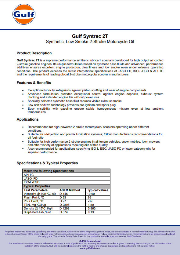 Supreme performance synthetic lubricant specially developed for high-output, air-cooled, 2-stroke gasoline engines. Its unique formulation, based on synthetic base fluids and advanced performance additives, ensures excellent engine protection, cleanliness and low smoke (even under extreme operating conditions). The product exceeds the latest international specifications.